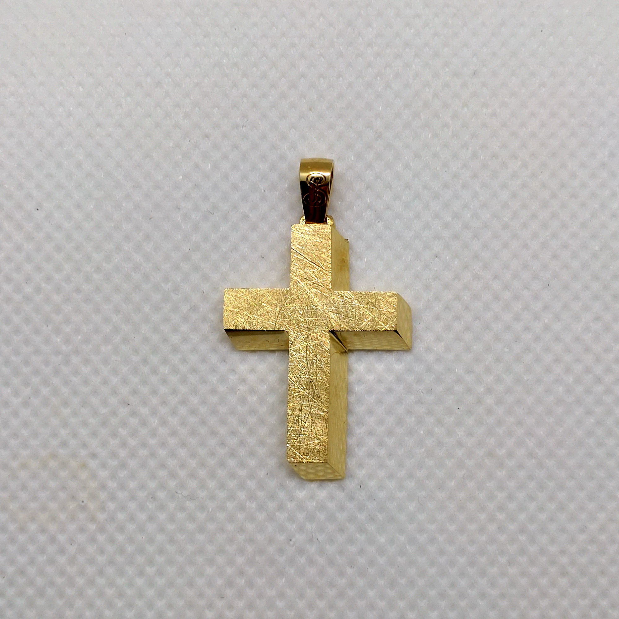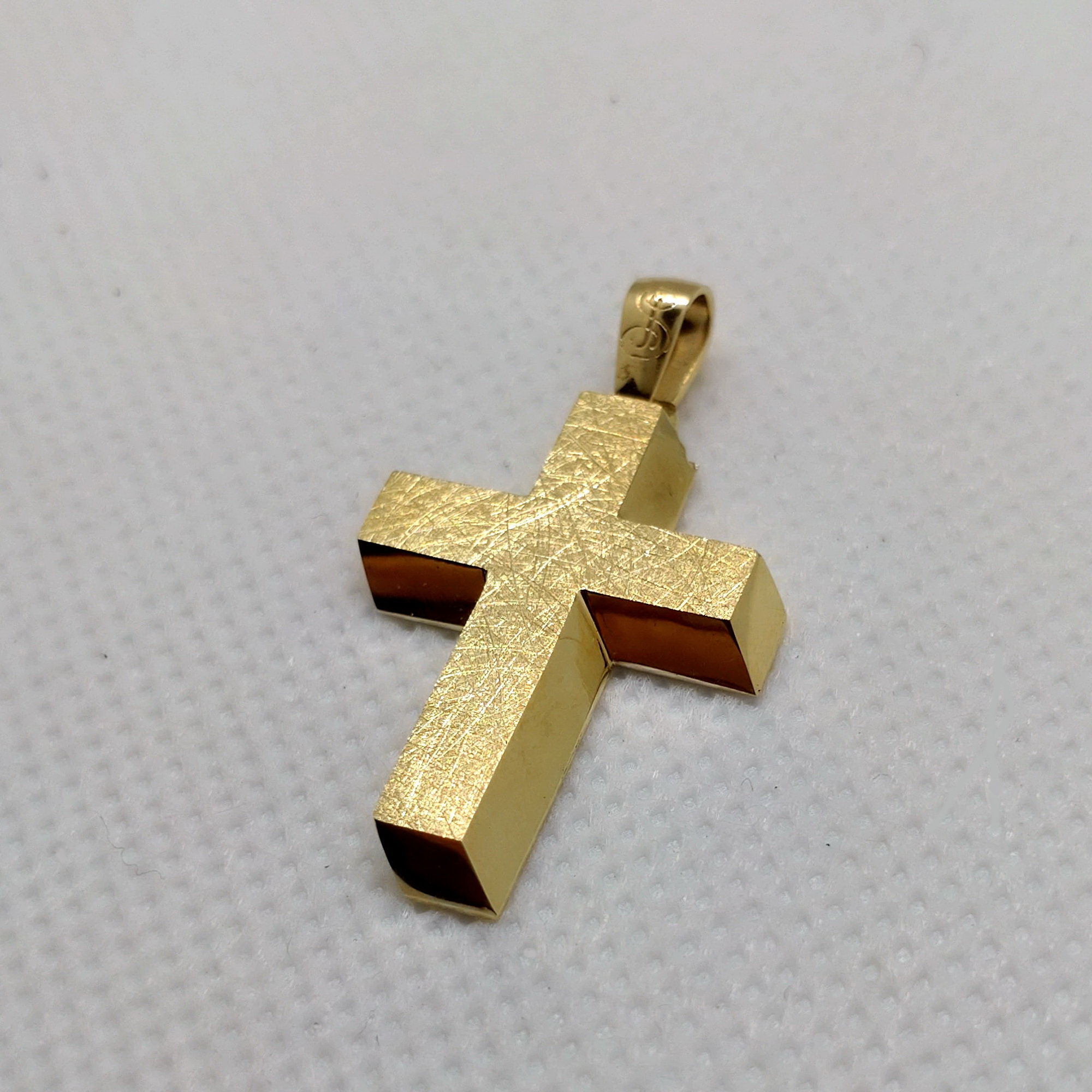 Σταυρός με τρισδιάστατο όγκο. Γυαλισμένο κίτρινο χρυσό στις πλαϊνές επιφάνειες, μάτι φινίρισμα στο κέντρο.. 14Κ κίτρινο χρυσό. Δυνατότητα χάραξης ονόματος ( προσφέρεται δωρεάν ). Παρακαλούμε επιλέξτε στο καλάθι σας το προϊόν Χάραξη Σταυρού Δωρεάν ). Στις αναγραφείσες διαστάσεις περιλαμβάνεται ο κρίκος.